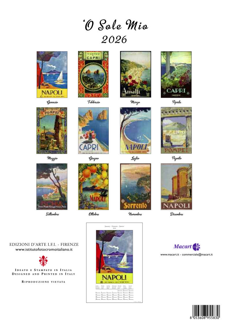 Celebrate the warmth, charm, and romance of Italy with the 2026 O Sole Mio Calendar by Instituto Fotocromo Italiano (IFI). This beautifully illustrated medium-format wall calendar (24 x 34 cm) features a curated selection of vintage-style artworks inspired by traditional Italian songs, sunlit landscapes, and timeless moments of la dolce vita.