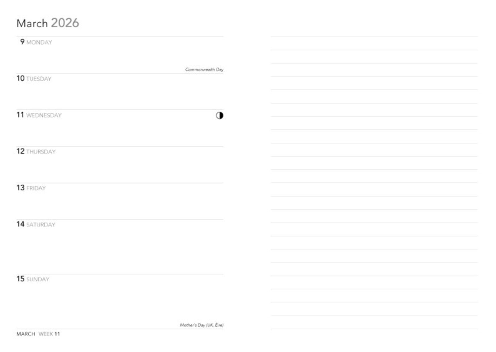 Week-to-view layout with lined note page opposite