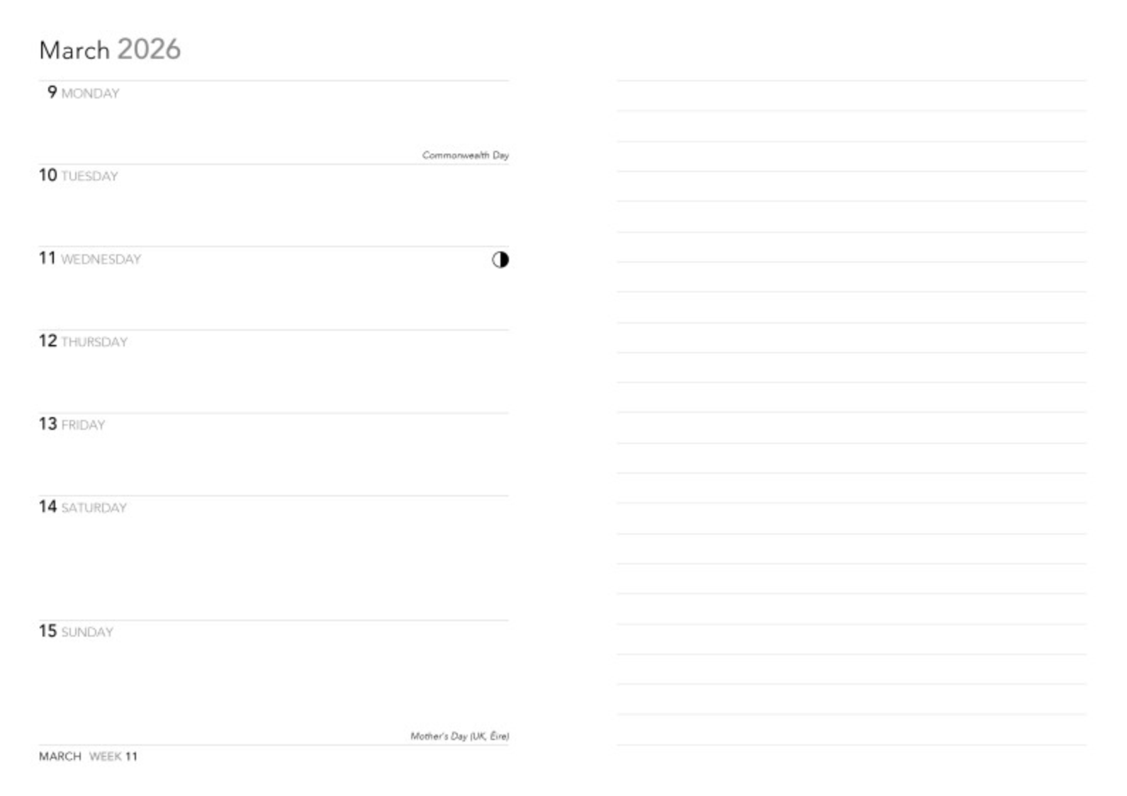 The standard format provides a convenient week-to-view layout on one page, with a lined page opposite for note-taking, journaling, or to-do lists. Flexible and lightweight, this diary slips easily into your bag, making it a perfect companion for daily planning.