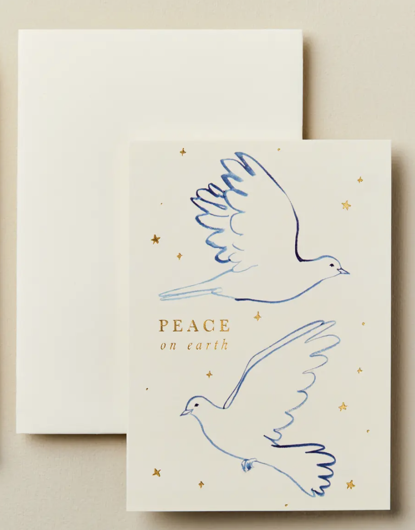 Share a message of hope and harmony with the Peace on Earth Card from Wanderlust Paper Co. Featuring two graceful blue doves on a cream background, this card is beautifully accented with shimmering gold foil detailing on both front and back.