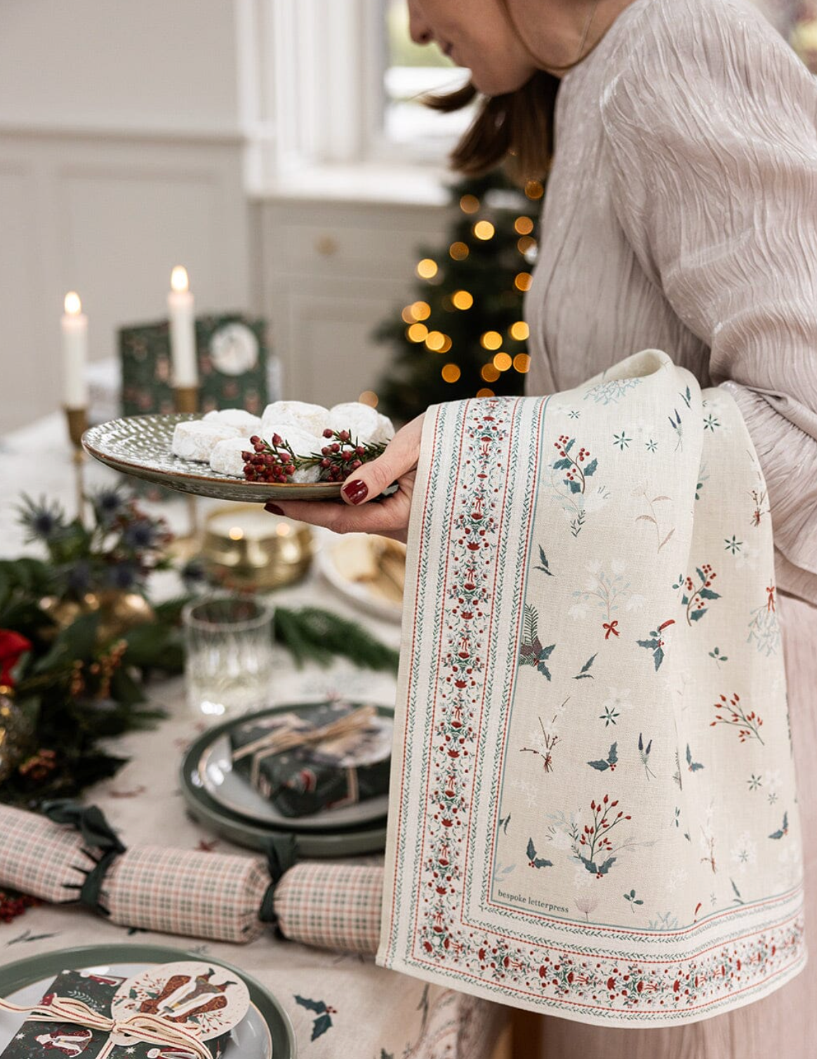 Bring festive refinement to your kitchen with this Bespoke Letterpress Heirloom Christmas Holly linen tea towel — a perfect blend of art, craftsmanship, and Christmas tradition.