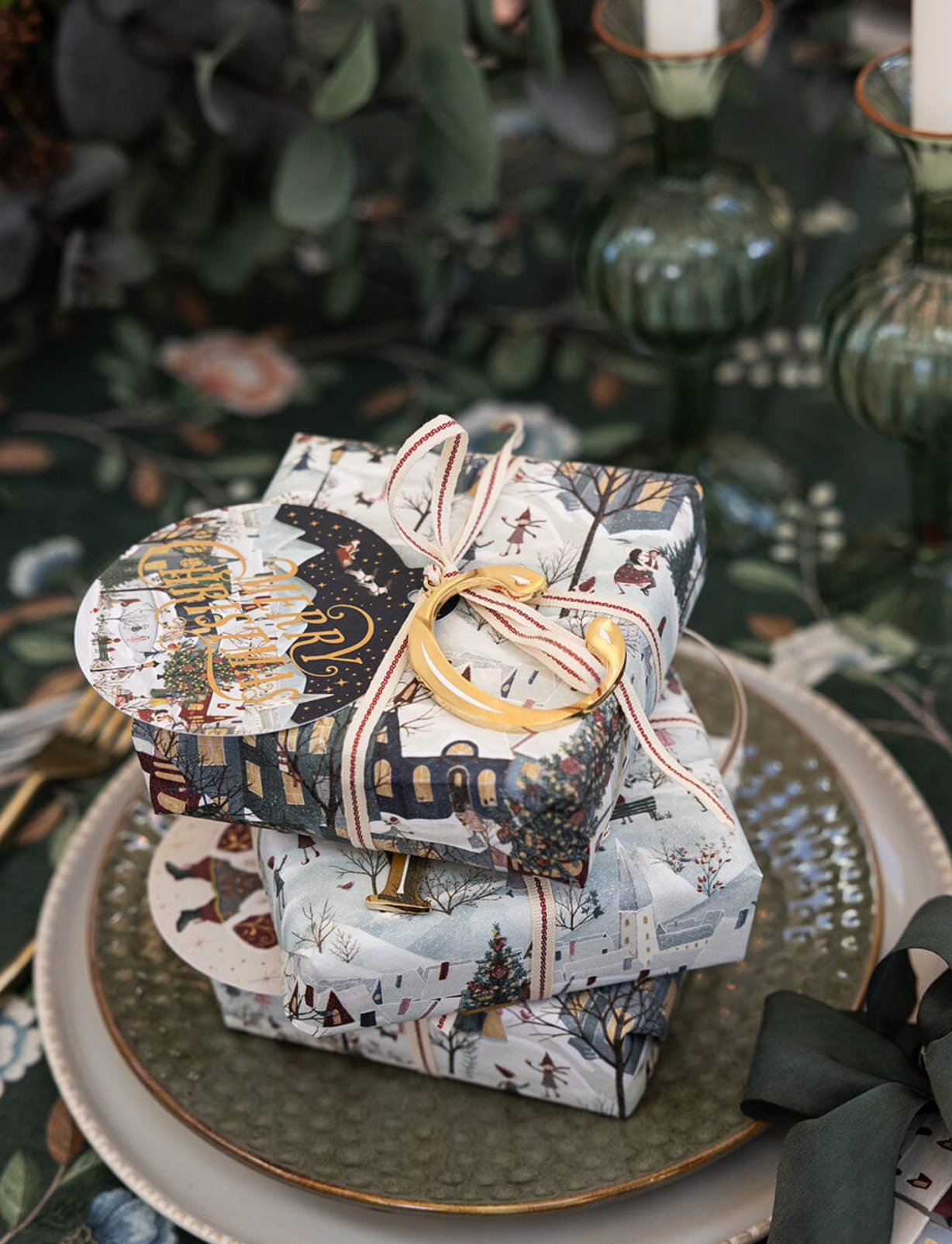Elevate your festive wrapping with the Christmas Village Gift Tag Set, a charming 12-pack of bauble-shaped tags featuring whimsical illustrations by Maja Lindberg. Each tag is adorned with intricate designs and finished with letterpress gold foil for a luxurious holiday sparkle.
