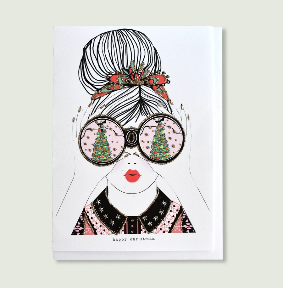 Send a stylish dose of festive cheer with the "Happy Christmas" greeting card by Verrier. This premium 5" x 7" card showcases printed original artwork, hand-embellished with luxurious gold glitter and painted accents—creating a dazzling, high-end finish.