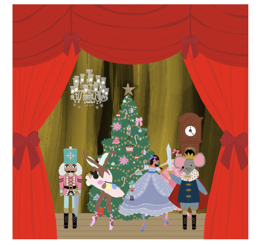 Bring a touch of holiday enchantment to your Christmas greetings with the "Nutcracker Scene" card by Verrier. This elegant 5" x 7" card features a printed original artwork inspired by the beloved Christmas classic, hand-embellished with sparkling glitter and painted details for a magical, festive finish.