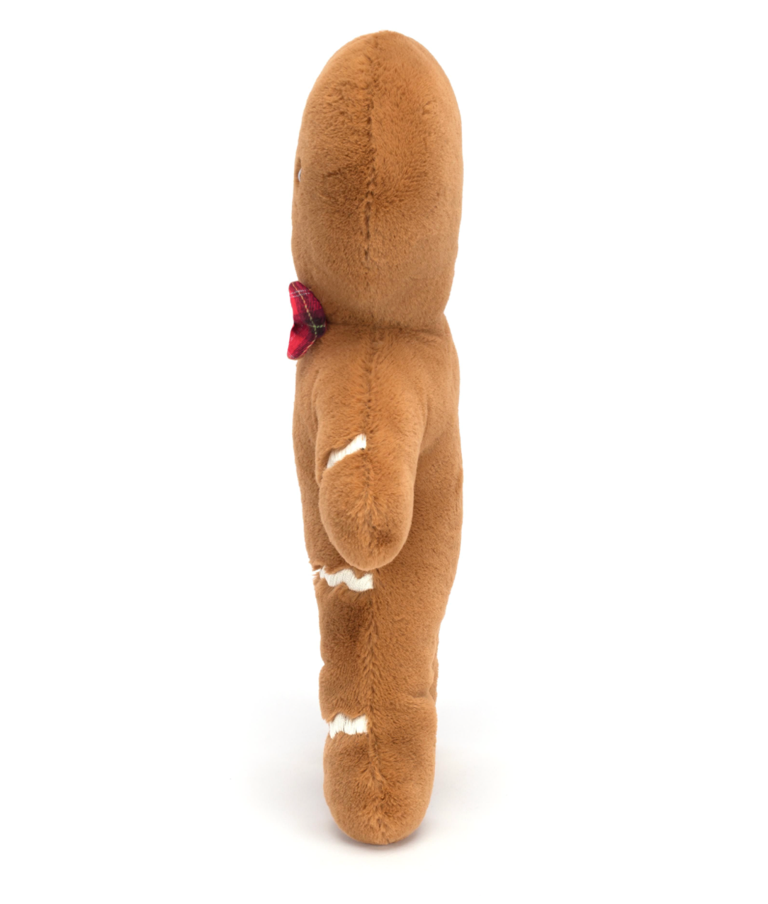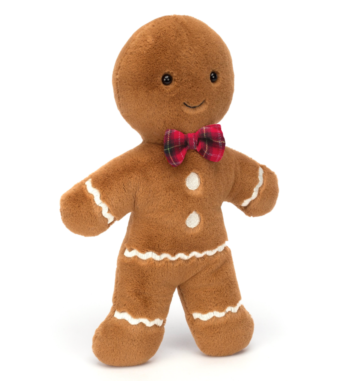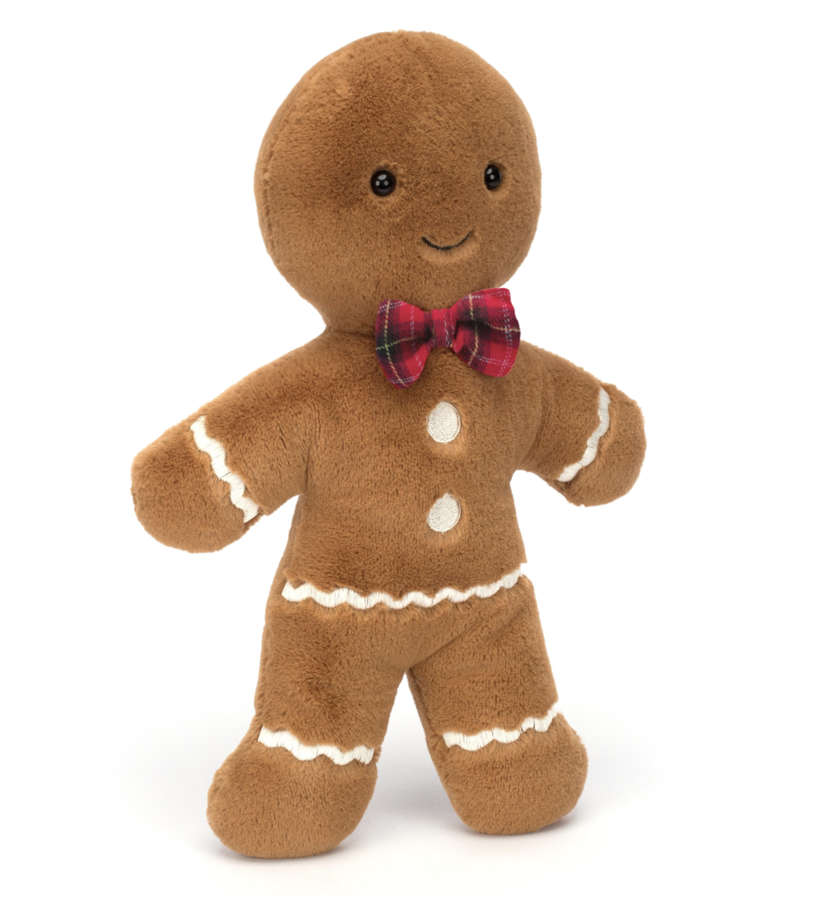 Jolly Gingerbread Fred may have hopped straight out of the tin, but this guy's always looking smart! In soft golden biscuit fur with scalloped stitch icing, embroidered buttons and a red tartan bow, Fred is a forever festive friend!