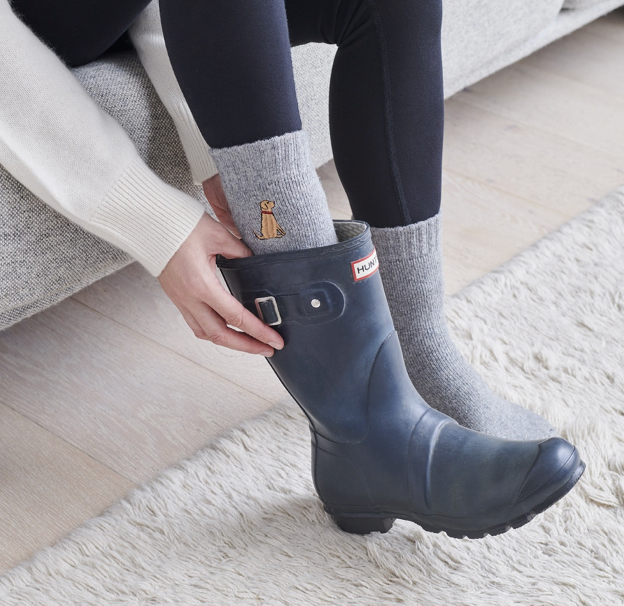 Featuring an adorable embroidered Fox Red Labrador on a pale grey wool background, they add a playful touch to your wardrobe. Ideal as bedtime socks for the chilliest months, they make a thoughtful gift for dog enthusiasts of all ages.