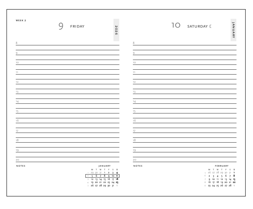 Measuring 95 × 140 mm, it’s perfect for slipping into your bag or keeping on your nightstand. With 416 pages of 80 gsm acid-free paper, this day-at-a-time planner provides a smooth, high-quality writing surface that’s ideal for all pen types — including fountain pens.