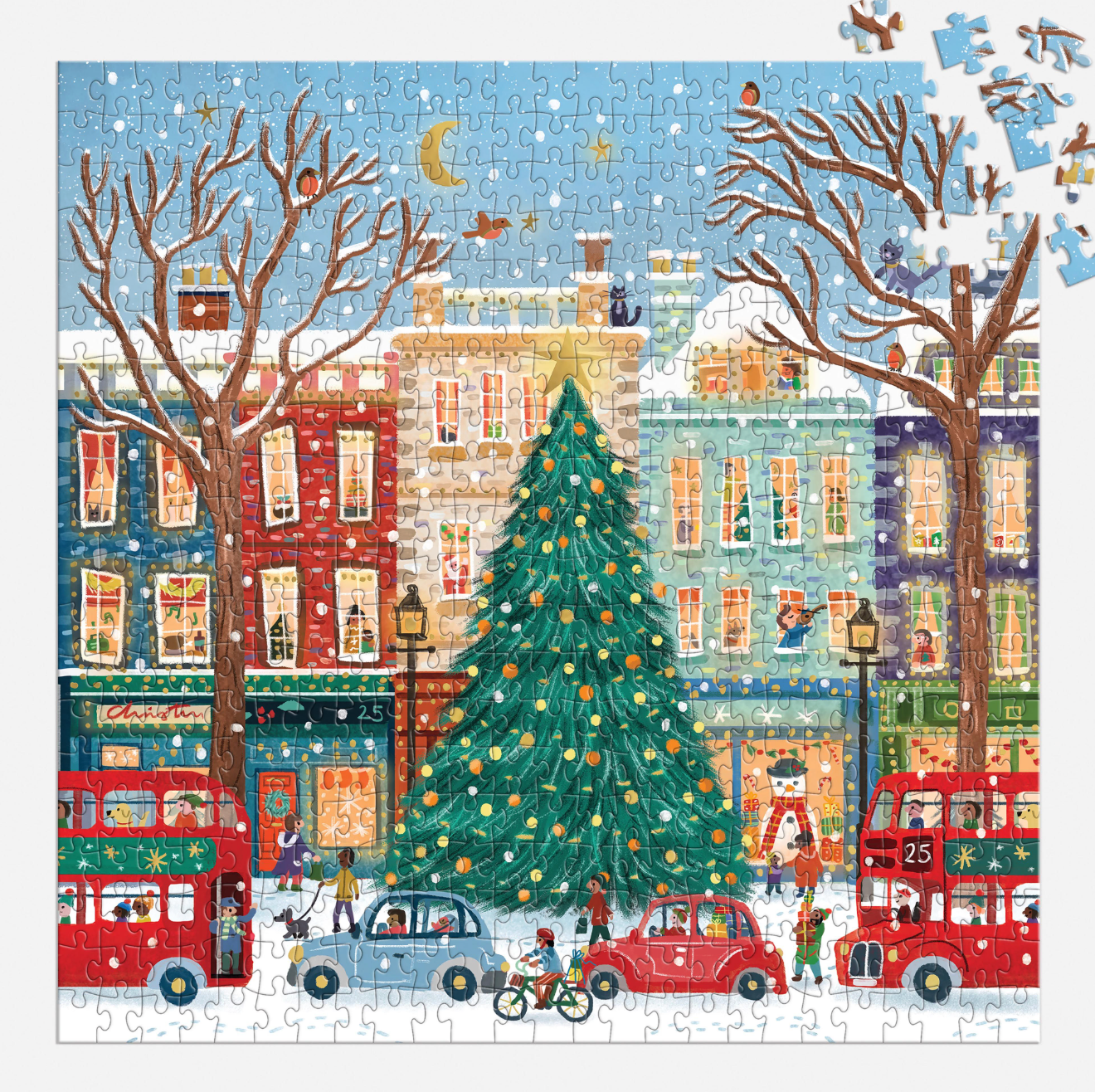 Bring the sparkle of the city at Christmas into your home with the Galison Tinsel City Foil Puzzle. Featuring a lively cityscape dressed in its holiday best, this 500-piece puzzle is accented with gold foil details that shimmer like festive lights.