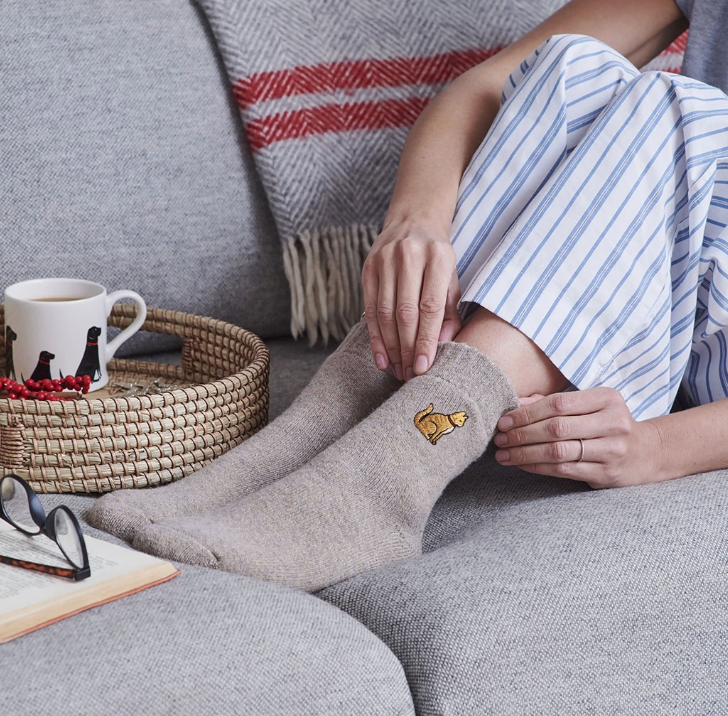 Knitted in a warm taupe wool blend, they offer gentle stretch and breathable insulation, keeping you comfortable year-round. The embroidered ginger cat sits neatly on the side of the sock — full of charm, whiskers and personality. A thoughtful gift for anyone who lives with a fiery feline friend or simply loves the colour and character of an orange cat.