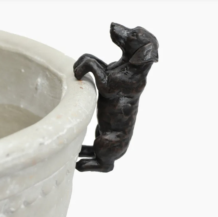 This Dachshund figurine is designed to hang from your planters and pots, adding a whimsical touch to any space.