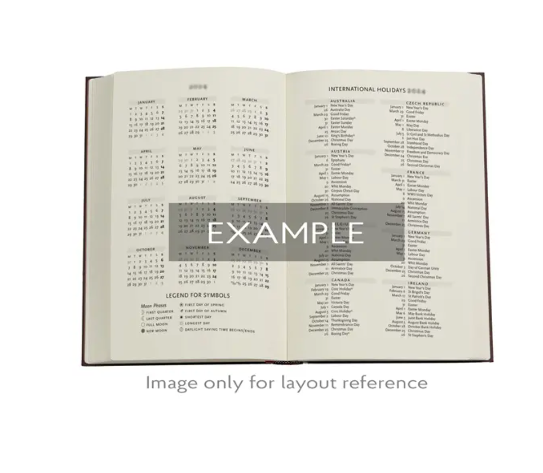 With a spacious horizontal layout, you'll have plenty of room to map out appointments, tasks, and goals across each week. Thoughtfully designed with international holidays, monthly overviews, and handy extras, this planner keeps everything at your fingertips.