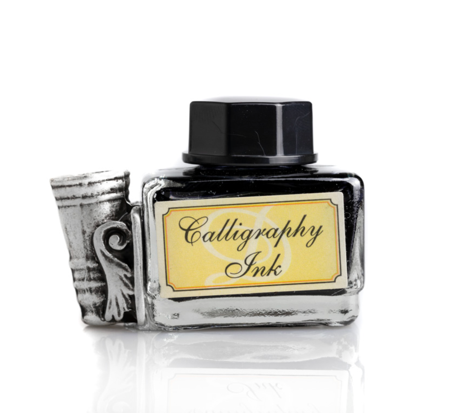 Complete Set: Includes a 15 ml bottle of black calligraphy ink, two replacement nibs, and a decorated metal pen holder attached to the ink bottle.